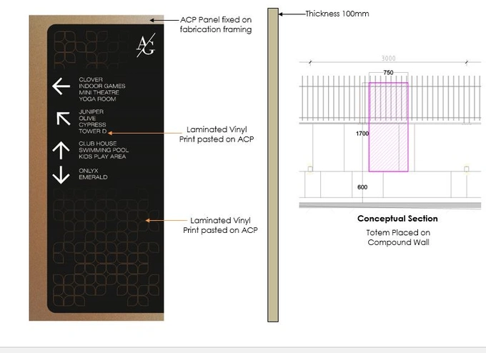 So, at Esprit architecture, we don’t stick to architectural projects alone; we also design the complete ecosystem that comes with it, like signage board design, for example. So, for this project with Adani Realty in Pune, we had to design a comprehensive signage graphic design package comprising of outdoor signs, interior displays and informative boards.
