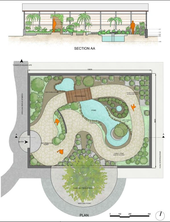 So, we first began to understand what to preserve and what to restore while redesigning it sensitively. Like, we focused on zoning and creating distinct zones for the Pollinators’ Paradise, the Aquatic Plants area & the Fernery. And then, we tried to include a cohesive design language with cobblestone pavement, educative zones and active composting areas in the garden layout.