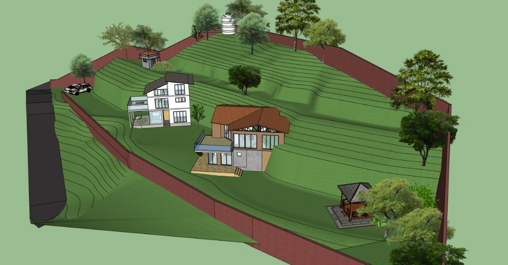 As for the design, we tried to shape everything as per the site’s natural contours. Like, we followed the site’s natural rhythm, maximized riverside views and tried to create hidden, unique vistas. We also planned gazebos, BBQ corners, and activity spots along the main slopes, and shared parking everywhere else. And thus, we could achieve a stark contrast as a whole. Like, we had a modular western home and an English Country eastern home all on the same site. Pretty interesting, right?